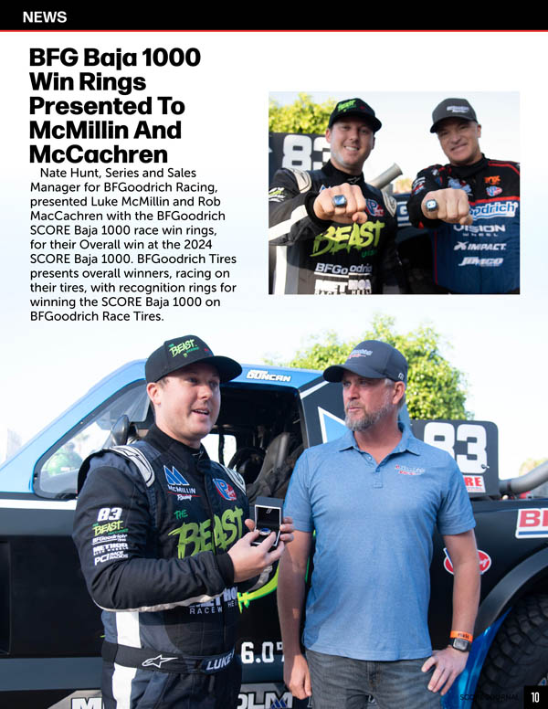 2024 –Luke McMillin teams with Rob MacCachren to win this race for the third time in four years as a team and the fourth in five years for ‘The Luke,’ giving Chevy its 13th overall win and BFGoodrich Tires its race-record 34th overall 4-wheel victory in the SCORE Baja 1000.